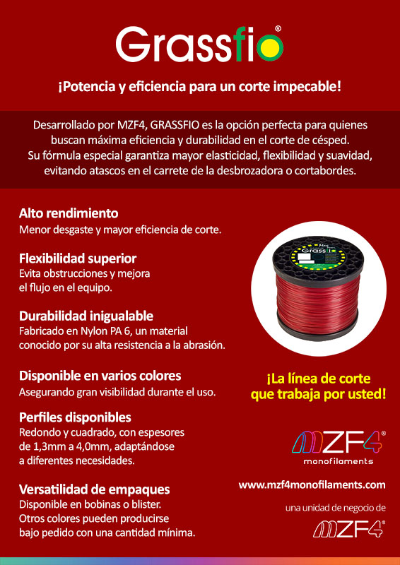 GRASSFIO es rendimiento que se ve en el corte y se siente en la productividad. Desarrollado por MZF4, su fórmula especial ofrece mayor elasticidad, flexibilidad y suavidad, evitando atascos y asegurando un flujo de trabajo continuo.
